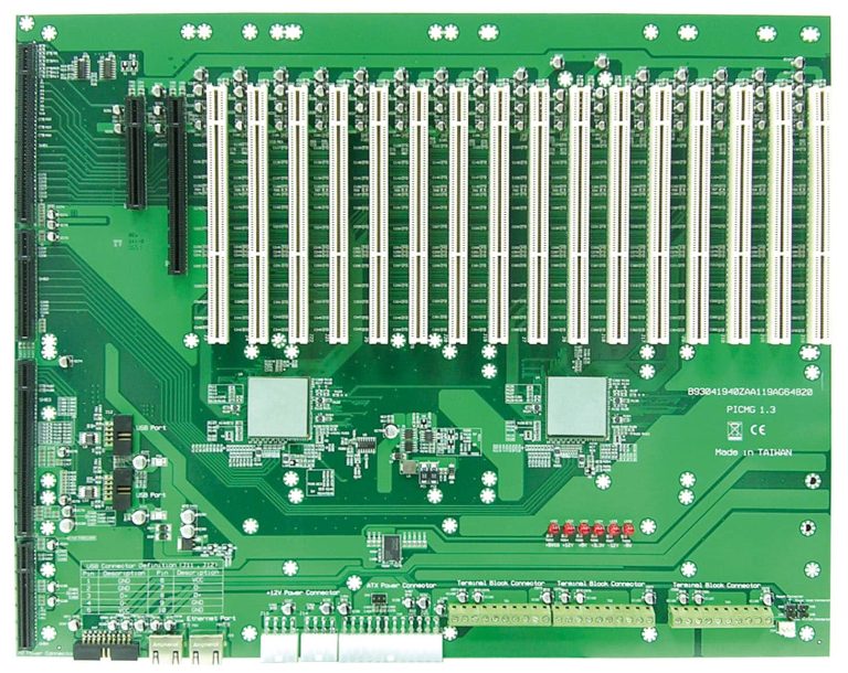 Los backplanes industriales son placas de circuito que proporcionan conectividad entre las SBC y los componentes periféricos, como almacenamiento, redes y fuentes de poder. Están disponibles en varios tipos, como PICMG 1.0, PICMG 1.3, PCI e ISA.