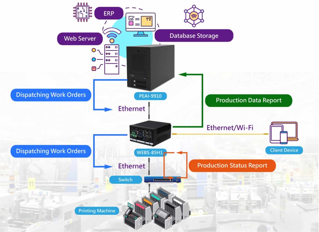 Portwell ha adoptado el WEBS-85H1 IoT Gateway y el PEAI-9910 Server como las tecnologías centrales de su solución de máquina de impresión inteligente. El WEBS-85H1 es un dispositivo IoT de grado industrial impulsado por procesadores Intel® Xeon® / Core™ i3/i5/i7/i9. Soporta múltiples protocolos de comunicación, recopilando y transmitiendo de manera eficiente información de producción de las máquinas de impresión, incluyendo el arranque de la máquina, tiempo inactivo, detenciones y condiciones anormales. Estos datos se utilizan para monitorear la velocidad de la máquina y las tasas de utilización en tiempo real, ayudando a las empresas a gestionar con precisión los costos de producción. Además, el sistema proporciona datos sobre objetivos de producción/salida, permitiendo una comprensión integral de la eficiencia de producción de cada máquina. Su diseño de amplio rango de temperatura también le permite operar de manera confiable en entornos industriales difíciles. El PEAI-9910 servidor sirve como el núcleo para el procesamiento y gestión de datos en el backend. Equipado con procesadores Intel® de 13ª/14ª generación Core™ i3/i5/i7/i9, soporta un procesamiento y análisis de datos eficientes, permitiendo un análisis en tiempo real de los datos de la máquina recopilados por el WEBS-85H1 para facilitar la toma de decisiones inteligentes. Sus ricas interfaces de E/S y capacidades de conectividad de base de datos permiten una integración fluida con el sistema ERP de la fábrica, mejorando la programación de producción, la automatización de la asignación de trabajos y la velocidad de respuesta. A través de la introducción del WEBS-85H1 y el PEAI-9910, este fabricante de máquinas de impresión ha abordado con éxito las ineficiencias y dificultades en el control de costos presentes en la producción tradicional.